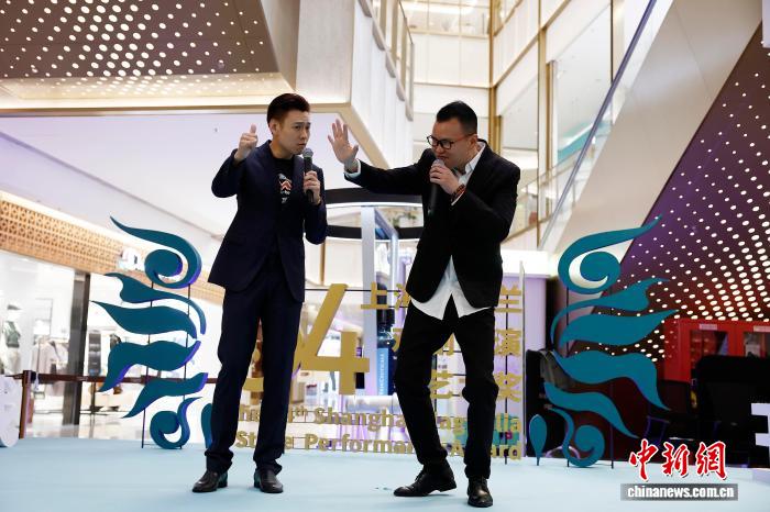 4月12日,上海市人民滑稽剧团演员陈靓和上海市人民滑稽剧团团长潘前卫(右)在新天地东台里演出。中新社记者 殷立勤 摄