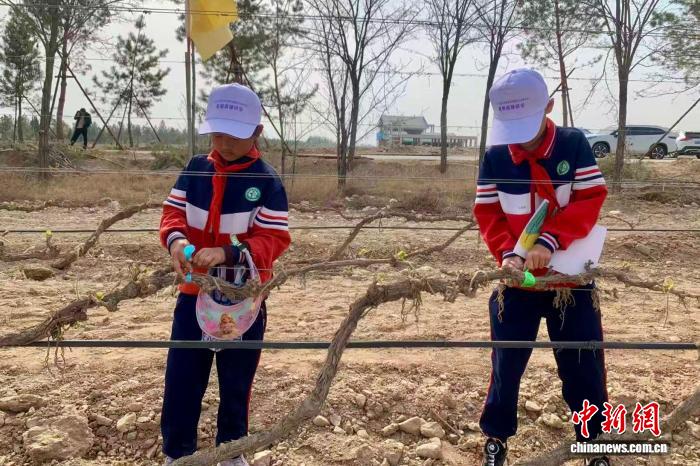 中新网银川4月15日电 (李佩珊 李晓歌)春风拂过贺兰山东麓,万亩葡萄园渐焕生机。4月15日,一场别开生面的酿酒葡萄展藤研学实践活动在宁夏戈兰酒庄葡萄种植基地热闹开启。来自银川市西夏区华西希望小学的100余名学生走出课堂、踏入田间,在春耕时节的葡萄园里开启了一场别开生面的劳动与文化研学之旅。