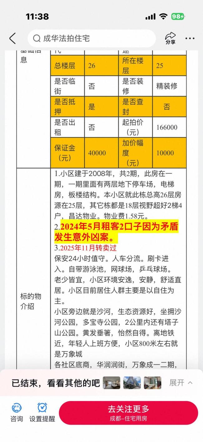 该房源为板楼结构,建成于2008年,位于总楼层26层中的第25层,南朝向,户型为二室二厅一卫,为精装电梯房,地下有两层停车场。拍卖页面特别标注了2024年5月在此发生的一起意外凶案,租客两口子因矛盾导致悲剧。