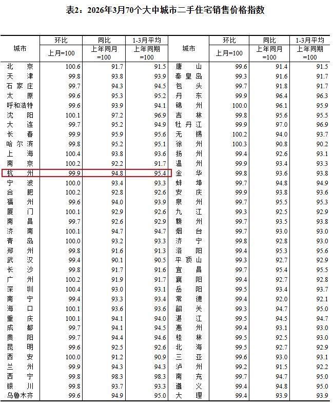 国家统计局公布了3月70个大中城市的价格变动情况。杭州3月新房价格环比上涨0.2%,与上月持平;同比上涨2.4%,较上月收窄。二手房价格环比下跌0.1%,跌幅略有缩小;同比下跌5.2%,跌幅继续扩大。