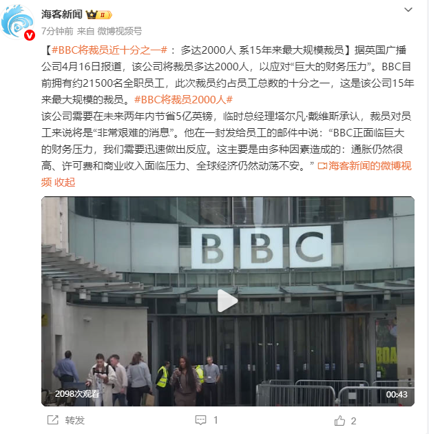 BBC将裁员近十分之一 应对财务压力!英国广播公司宣布将裁员多达2000人,以应对财务压力。目前BBC拥有约21500名全职员工,此次裁员约占员工总数的十分之一,是该公司15年来最大规模的一次。